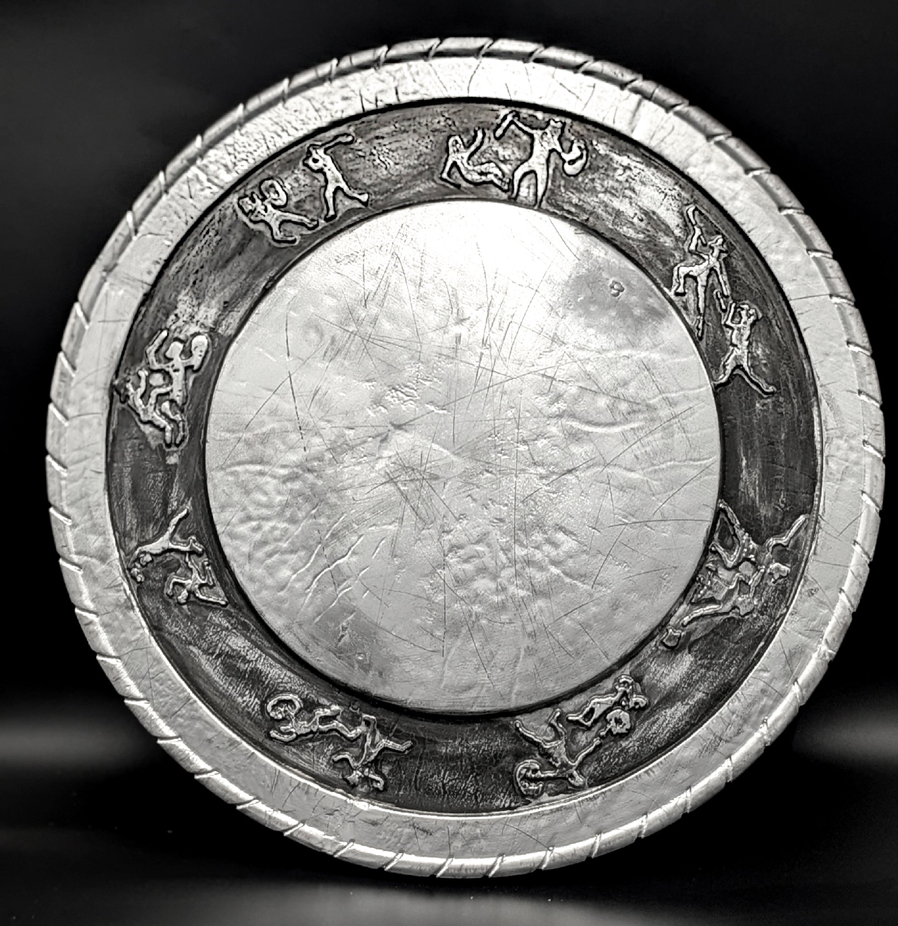 - Finish: Metallic silver with aged relief band and hammered center